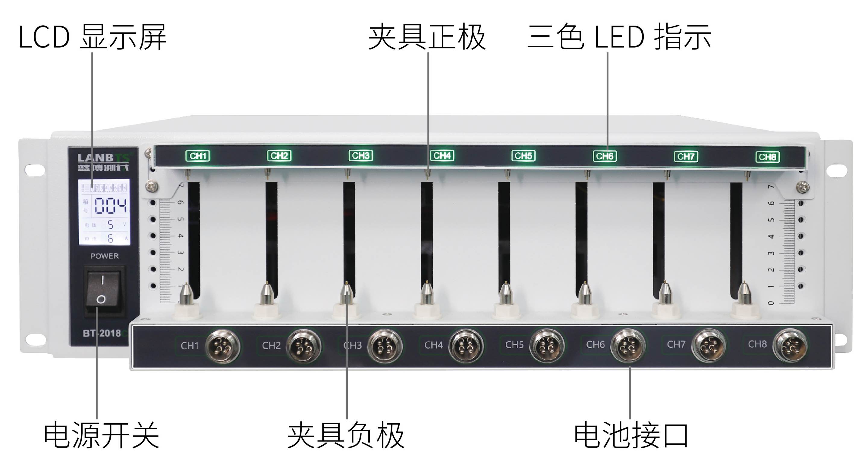 1、前面板既有四線制頂針夾具,也有航空插頭,兩種接口的應(yīng)用能滿足絕大部份電池的接入測(cè)試;